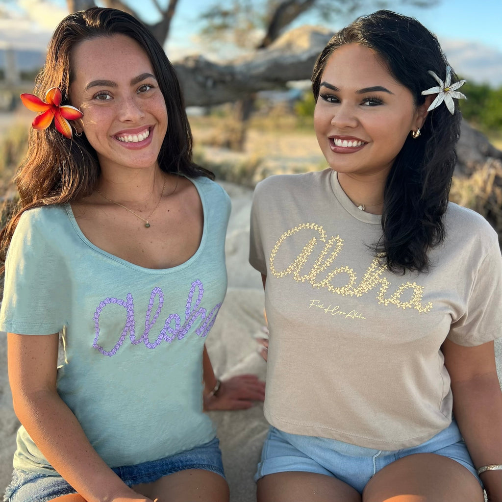 Aloha Pikake design "because Aloha smells so Beautiful!" Designed with each unique and intriquite flower to become the Aloha we want to be in this world. Aloha has manly positive meanings as Hello, Goodbye, I Love you, etc. This new designed top not only looks and feels amazing but embodies the heart of Aloha-love, kindness and warmth. Perfect gift for those special occasions and everyday moments when we want to share a little extra with those around us. History: Princess Ka'iulani named the Pikake flower after her fond connection with the peacocks in her backyard. Pikake flowers are one of the favorites among Hawaiian Royalty!
